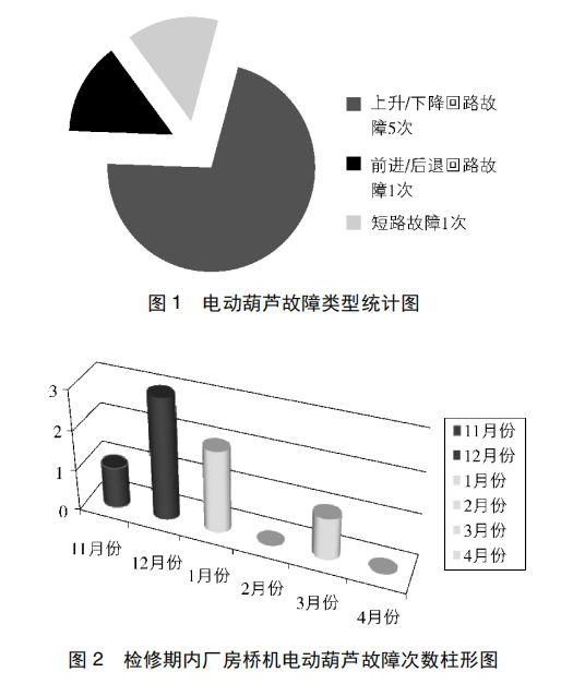 通過對 2013—2014 年檢修期電動葫蘆故障類型統計( 圖 1) 及檢修期內廠房橋機電動葫蘆故障次數柱形圖( 圖 2) 的調查分析得出: 上升/下降控制回路故障次數為5 次,前進/后退控制回路故障 1 次,短路故障 1 次。由此可見,電動葫蘆控制回路的可靠性有待進一步提高。