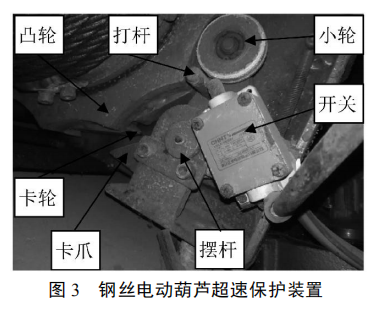 鋼絲繩電動葫蘆的超速保護裝置一般只能安裝在電動葫蘆內部,比如測速的光電傳感器安裝在電動葫蘆減速器的齒輪上;或者是在卷筒上安裝一套機構(見圖 3),擺桿一頭是在凸輪上轉動的小輪,另一頭是卡爪。卷筒以正常速度轉動時,小輪、打桿和卡爪隨著凸輪擺動,此時擺動的幅度較小,打桿不會打到開關且卡爪不會碰到安裝在卷筒上的卡輪。當轉速越來越快時擺桿的擺動幅度變大,打桿和卡爪的擺動幅度也跟著變大,當超速時打桿觸動開關,切斷電機電源使電動葫蘆制動器動作。該機構有二次保護作用,即當電動葫蘆制動器失效轉速繼續增加時,卡爪擺動幅度將大到使其卡住卡輪,實現第二制動,完成超速保護。