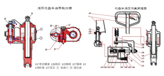 手動液壓搬運車又稱地牛,適用于商場、超市、小型倉庫等場所,同時適用于防火防爆需求的場所,使用更加安全。手動液壓搬運車的液壓系統(tǒng)工作原理如下: