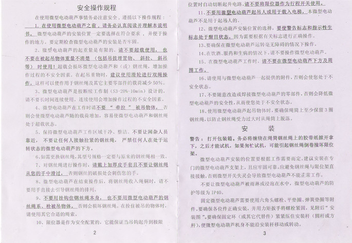 小型電動葫蘆的使用手冊,一般包含一些必要的說明、技術參數表、安全操作規程、安裝、操作、保養、故障與排除、接線原理、零件清單等內容。