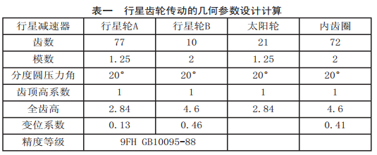 行星齒輪減速器的主要傳動結構由行星輪、太陽輪、內齒圈三部分組成。相對于其他減速器,具有高剛性、高精度、高的扭矩與體積比等優點。尤其傳動效率高,單機行星齒輪減速器效率在97%-98%之內。行星減速器的行星齒輪傳動的集合參數設計計算如下表。