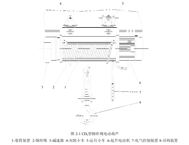 CD1型鋼絲繩電動葫蘆通電時,帶錐形轉子的起升電機,通過彈性聯(lián)軸器,直接驅動減速器輸入軸的齒輪軸,經過三級齒輪減速,由減速器輸出軸的空心軸驅動卷筒轉動,從而能將鋼絲繩纏繞使吊鉤作升、降動作,斷電時,起升電動機的錐形轉子起制動作用,電動葫蘆遂停止工作。起升電動機和運行小車的啟、停動作都由電氣控制裝置操縱。