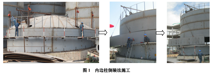 內邊柱倒裝法施工步驟:基礎驗收→儲罐排版開料→底板組裝→下層傾斜壁板組裝→第一圈壁板(自上往下)組裝→第一圈壁板(自上往下)與罐頂組裝→安裝脹圈和內邊柱→安裝拱頂吊臂→內邊柱起吊第一圈壁板與罐頂、組裝第二圈壁板、脹圈下落并重新脹緊→組裝第三圈壁板……倒數第二圈壁板,吊裝裝置除移,質量總檢→防腐→竣工。