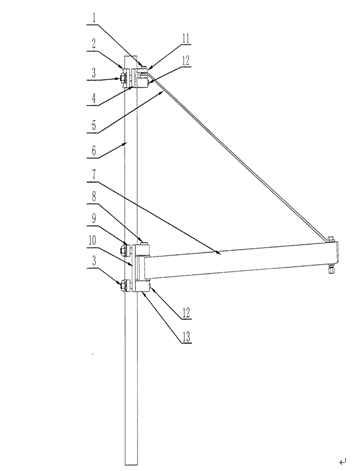 這種簡易微型電動葫蘆支架,包括立柱(6)、加強條(5)、支撐管組件(7)、上固定座、下固定座,其特征是:所述的上固定座包括上固定后座(2)和上固定前座(4),上固定后座(2)和上固定前座(4)固定在立柱(6)上,上固定前座(4)上設有上掛耳(11),上掛耳(11)上設有上固定軸銷(1);下固定座包括下固定后座(9)和下固定前座(10),下固定后座(9)和下固定前座(10)固定在立柱(6)上,下固定前座(10)上設有下掛耳(13),下掛耳(13)上設有下固定軸銷(8);加強條(5)的上端通過加強條墊片或軸承(17)鉸接在上固定軸銷(1)上,支撐管組件(7)的內端鉸接在下固定軸銷(8)上,支撐管組件(7)的外端與加強條(5)的下端固定連接。
