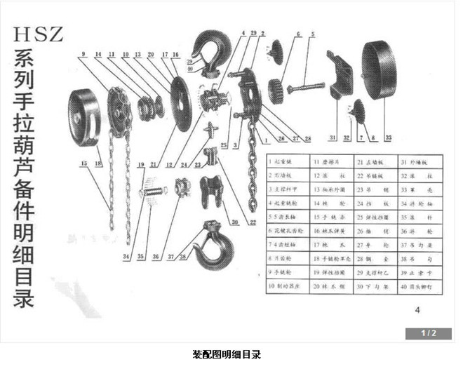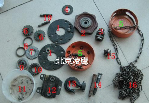 下面介紹一下手拉葫蘆的各部件名稱對(duì)照表,1位側(cè)板,2為手鏈輪,3位起重鏈輪,4位摩擦片,5位外殼,6位四齒短軸,7為棘輪,8位軸承外套,9位摩擦片座,10位花鍵孔齒輪,11為軸承滾珠,12外側(cè)板,13固定鉤,14五尺長(zhǎng)軸,15起重鏈靠輪,16手拉鏈,17起重鏈,18起重吊鉤,9固定軸。