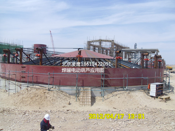 焊罐電動葫蘆是用于新建儲油罐群體吊裝施工中,可以大大減輕施工人員的勞動強度,提高工作效率。但是由于油罐較大型,并噸位較大,所以起重量的確定是保障安全的前提。
