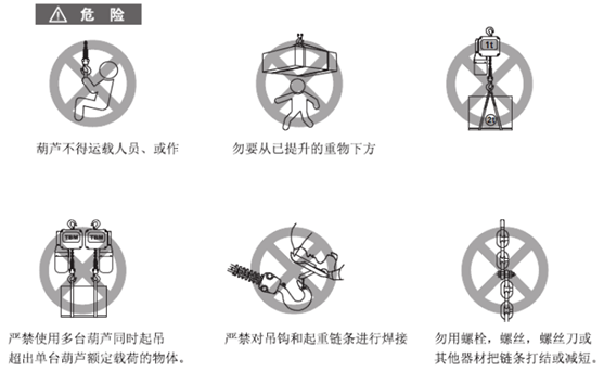 不正確的使用或疏忽對(duì)于電動(dòng)葫蘆的維護(hù)保養(yǎng),均可能導(dǎo)致危險(xiǎn)狀況的發(fā)生。例如:發(fā)生提升的負(fù)載降落不下來(lái)等危險(xiǎn)狀況。在安裝、操作或維修之前,輕仔細(xì)閱讀并且遵守使用說(shuō)明書(shū)中關(guān)于安全與操作說(shuō)明的準(zhǔn)則,以及所有的注釋內(nèi)容。