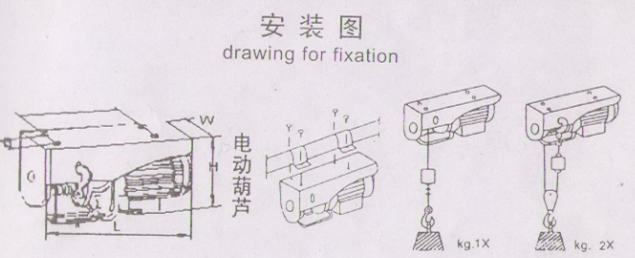 固定微型電動(dòng)葫蘆需要使用六角頭螺栓、平墊圈、彈簧墊圈等附件。要確保各位件正確安裝,并用力矩扳手將螺栓緊固,“安裝圖”。要確保固定環(huán)(或其它代替件)緊緊壓住安裝桿(圓桿或方桿),使微型電動(dòng)葫蘆機(jī)身不能沿安裝桿移動(dòng)或轉(zhuǎn)動(dòng)。