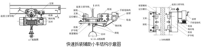 該裝置包括滾輪、支架、底板、護導輪、框座和手搖卷揚機等;底板的下面固定裝有2個滑輪,上面對稱固定裝有2個護導輪和4個鎖緊螺栓,面向起重主梁導軌的一面對稱固定有支架和框座;支架采用角鋼。框座為方框形,兩者相對的內側分別固定裝有1對滾輪,兩者間的底板上固定有護導輪和鎖緊螺栓,底板的另一面固定安裝有滑輪;框座的外側面固定安裝有手搖卷揚機,手搖卷揚機設有搖臂,輸出軸上裝有輪盤,亂盤內裝有鋼索,鋼索穿過滑輪與吊環連接;起重主梁導軌置于護導輪、鎖緊螺栓與滾輪之間,導軌上裝有電動葫蘆起重機且一側還裝有電動葫蘆起重機快速拆裝輔助小車。