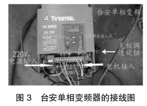 ① 采用臺(tái)安單相變頻器,代替轉(zhuǎn)子串電阻,導(dǎo)入變頻器調(diào)速程序,在接線端子處接入導(dǎo)線,實(shí)現(xiàn)無(wú)級(jí)調(diào)速。