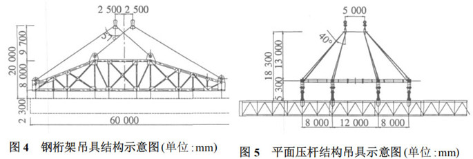 2、采用平面壓桿結構(圖5),使吊具結構高度降低,吊索具重量減輕。通過計算,當吊索具總高為18.3m時,外側吊索的豎向夾角為40°,吊索角度合理,吊索直徑較小,吊索具總重約為170t,浮吊吊重富余120t,吊高富余大2.7m。吊裝安全性大幅提高。