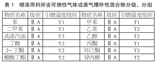 爆炸性氣體環境電力裝置設計前要有爆炸危險區域劃分圖,對于簡單或小型廠房,可采用文字說明表達。《涂裝作業安全規程 涂漆工藝安全及其通風凈化》(GB 6514-2008)明確了封閉或半封閉涂漆工藝裝備內部為 1 區爆炸性危險區域,其開敞面以外,水平距離 3m,垂直距離 1m 以內的空間區域劃為 2 區爆炸性危險區域。按照《爆炸危險環境電力裝置設計規范》(GB 50058-2014)的強制性條文,選擇隔爆型(“d”)結構符合 1 區爆炸性危險區域的要求,防爆電動葫蘆采用了隔爆電動機、隔爆電氣控制柜和隔爆按鈕。噴漆用料所含可燃性氣體或蒸氣爆炸性混合物分級、分組見表1。
