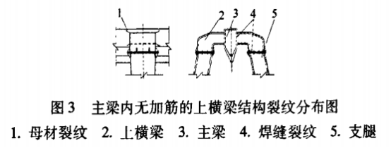 上橫梁與主梁連接處在焊縫及母材上都出現過裂紋,如圖3所示。主要原因是主梁內部與上橫梁腹板連接對應位置缺少加勁肋板,造成主梁與上橫梁之間傳力不暢,腹板局部穩定性不足,加上焊接應力集中,致使在連接部位造成疲勞裂紋。