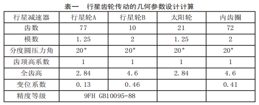 行星齒輪減速器:主要結構由行星輪、太陽輪、內齒圈三部分組成。相對于其他減速器,具有高剛性、高精度、高的扭矩與體積比等優點。尤其傳動效率高,單級行星齒輪減速器效率在97%-98%之內。行星減速器的行星齒輪傳動的幾何設計計算如下表所示: