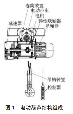 電動葫蘆通常稱為電葫蘆,是一種常見的輕小型的起重設備。常見電動葫蘆的控制方式有兩種,一是使用按鈕在地面跟隨操作,二是在司機室內操控或采用無線遠距離控制。電動葫蘆一般由電機、傳動機構和卷筒裝置或鏈輪機構組成。電動葫蘆可以分為鋼絲繩電動葫蘆和環鏈電動葫蘆兩種。鋼絲繩電動葫蘆可以分為鋼絲繩電動葫蘆和環鏈電動葫蘆兩種。鋼絲繩電動葫蘆又可以分為單速提升型、雙速提升型、微型電動葫蘆、卷揚機、多功能提升機等多種類型?;S常用電葫蘆為微型電動葫蘆或懸臂葫蘆,往往在加料或維修車間頻繁進行檢維修作業的固定點位安裝,設備拆裝位置因綜合考慮現場空間安全和建造成本往往不會安裝電動葫蘆,化工廠常用電動葫蘆結構組成如圖1所示。