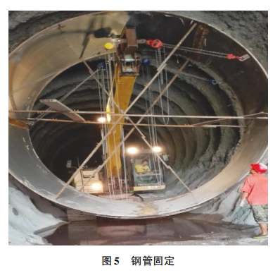 鋼管翻轉(zhuǎn)及固定:采用平板車將鋼管運(yùn)輸?shù)剿矶纯?利用洞頂錨環(huán)和卷?yè)P(yáng)機(jī)進(jìn)行鋼管翻轉(zhuǎn)。挖掘機(jī)液壓反鏟大臂伸到鋼管內(nèi)壁頂部,將專用支架兩側(cè)的兩臺(tái)手拉葫蘆與鋼管上的錨環(huán)進(jìn)行固定。