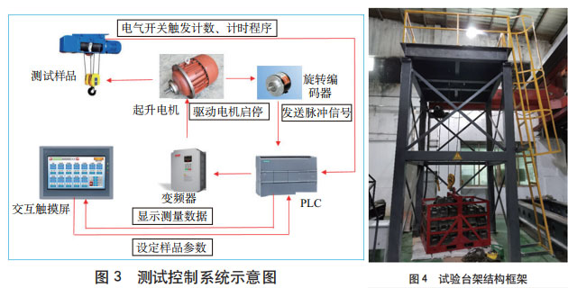 3)觸發、制停距離檢測。采用旋轉編碼器可實現觸發距離與制停距離的測量。動態負載試驗下,觸發、制停距離過大,或者無法實現制動功能,表明棘輪棘爪型安全制動器可靠性無法滿足要求。測試裝置主要由鋼結構試驗臺架、測試控制系統、輔助吊運裝置、梯子平臺等構成,見圖4。該測試裝置功能包括:1)對5t及以下單軌小車式及雙梁小車式鋼絲繩電動葫蘆進行靜態和動態試驗(不含小車行走功能);2)測量、顯示并記錄空載變頻調速下電動葫蘆棘輪制動器的觸發速度;3)測量、顯示并記錄負載墜落試驗下電動葫蘆棘輪制動器的觸發速度、觸發制停時間、觸發后的制動下滑量。