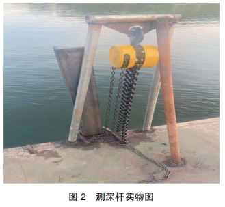 3、制作手拉葫蘆支撐:在測深桿左右兩側分社兩根無縫鋼管,頂部加一根短橫桿,橫桿下段中部焊接手拉葫蘆掛口,完成后焊接一根斜長支撐桿,所有桿件連接均采用焊接。