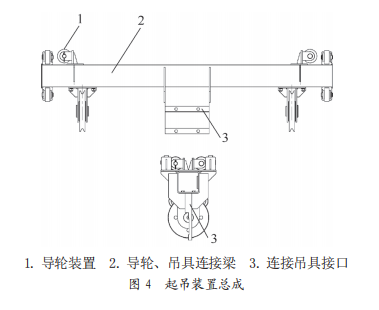 4)相較傳統(tǒng)葫蘆起升裝置可不設(shè)置重錘限位。起吊裝置總成上的水平輪裝置在葫蘆架矩形管導(dǎo)軌上運(yùn)行,當(dāng)徑向水平輪裝置運(yùn)行至葫蘆支座下矩形管處時(shí),導(dǎo)向輪與葫蘆架矩形管底面接觸停止,防止沖頂,有效提高了起升上極限約 200 mm。