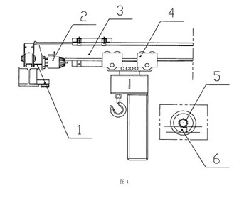 型結構,小車(4)為環鏈葫蘆,掛于主梁下翼緣板上運行,并完成升降動作,葫蘆運行為電動,停止手板固定。打車三合一裝置(2)至于端梁一端,該裝置由電機(自帶制動器)減速器組成,減速器