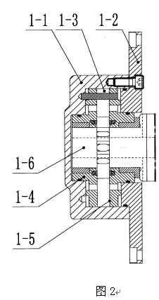 (2)如圖2所示,其中:非圓輪系液壓馬達(dá)1主要由殼體1-1、前端蓋1-2、非圓輪齒輪組1-3、上配流盤(pán)1-4、下配流盤(pán)1-5、軸1-6組成,該部分的主要功能是將壓力水、壓力油等液壓源的液壓能轉(zhuǎn)換成旋轉(zhuǎn)的機(jī)械能驅(qū)動(dòng)手拉葫蘆進(jìn)行工作。如圖5所示,所述非圓輪齒輪組由外齒圈1-3-1、轉(zhuǎn)子1-3-2及滾輪1-3-3組成,所述滾輪1-3-3設(shè)在內(nèi)部,轉(zhuǎn)子1-3-2設(shè)在滾輪1-3-3和外齒圈1-3-1中間,通過(guò)轉(zhuǎn)子1-3-2帶動(dòng)滾輪1-3-3和外齒圈1-3-1轉(zhuǎn)動(dòng)。