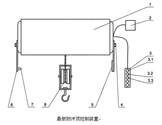 新研制的采用光電技術的防沖頂技術,當電動葫蘆的掛鉤向上運行到掛鉤上頂面距離電動葫蘆外殼下沿A+100 mm處,光電開關與光電開關反射板之間被掛鉤遮擋,由光電控制電路使掛鉤上升停止,停止在上行極限位置之下。本發明的構思新穎、結構輕巧、制作簡單、成本低廉,使用方便、動作靈敏、安全可靠,消除安全隱患,是用光電技術解決電動葫蘆防沖頂的新突破。可廣泛推廣應用于所有電動葫蘆生產企業的新產品制造中,也可推廣應用于所有電動葫蘆使用單位,對電動葫蘆進行技術改造,增加安全保障,消除安全隱患。