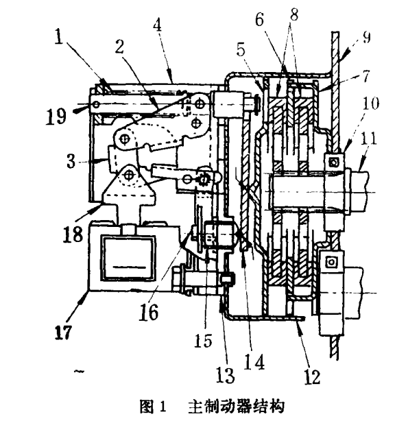 備注:1為壓力彈簧,2、3為連桿A、B,4為彈簧壓板,5/6/7為制動(dòng)盤(pán)A/B/C,8為制動(dòng)輪,9為機(jī)架,10為軸承,11為一級(jí)軸齒輪,12,13為制動(dòng)電磁鐵支架A、B,14為制動(dòng)器杠桿,15為調(diào)整螺釘,16為調(diào)整杠桿,17為固定鐵心,18為可動(dòng)鐵心,19為制動(dòng)桿。