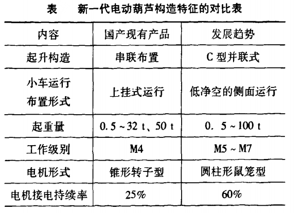 鋼絲繩電動(dòng)葫蘆之后的發(fā)展方向應(yīng)向重載、大型、高性能化、模塊化發(fā)展,成為替代通用橋式起重機(jī)的發(fā)展趨勢(shì)。新一代的電動(dòng)葫蘆與現(xiàn)有產(chǎn)品的構(gòu)造特征對(duì)比表如下: