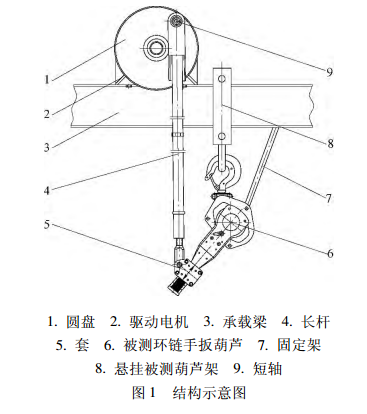環(huán)鏈?zhǔn)职夂J需要懸掛在規(guī)定工位上,將驅(qū)動(dòng)裝置的電機(jī)以一定角度和一定距離固定在懸掛環(huán)鏈?zhǔn)职夂J的承載梁上, 角度要求電機(jī)輸出軸與環(huán)鏈手扳葫蘆的操作手柄相垂直, 距離要求安裝完驅(qū)動(dòng)裝置后不發(fā)生干涉。在固定好驅(qū)動(dòng)電機(jī)后,在電機(jī)輸出軸上安裝一個(gè)周邊焊有小短軸的圓盤,在小短軸上通過(guò)關(guān)節(jié)軸承連接一根長(zhǎng)桿(長(zhǎng)桿可分為幾段,相互通過(guò)螺紋扣連接,方便調(diào)節(jié)距離,關(guān)節(jié)軸承可以調(diào)整角度),在長(zhǎng)桿的另一端通過(guò)螺紋扣連接一個(gè)套 (套可以靈活轉(zhuǎn)動(dòng)) ,通過(guò)該套與環(huán)鏈?zhǔn)职夂J的操作手柄進(jìn)行連接,見圖1進(jìn)行試驗(yàn)時(shí),首先接通電源,電機(jī)帶動(dòng)安裝在輸出軸上的圓盤做圓周運(yùn)動(dòng),圓盤上的短軸帶動(dòng)長(zhǎng)桿以電機(jī)輸出軸為中心進(jìn)行上下擺動(dòng),這樣,環(huán)鏈?zhǔn)职夂J的手柄在長(zhǎng)桿上連接套的帶動(dòng)下一起上下擺動(dòng),從而實(shí)現(xiàn)重物上升、下降的動(dòng)作。為了避免在進(jìn)行試驗(yàn)時(shí)環(huán)鏈?zhǔn)职夂J的轉(zhuǎn)動(dòng),可以在承載環(huán)鏈?zhǔn)职夂J的梁上焊接一固定支架,通過(guò)支架將環(huán)鏈?zhǔn)职夂J的相對(duì)位置固定好, 從而實(shí)現(xiàn)更好,更有效的操作。