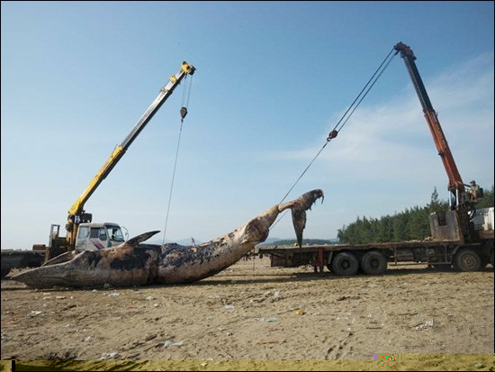 據報道,當地時間5月28日。越南義安省,當地海灘出現一條死因不明的鯨魚尸體。民眾用兩臺隨車起重機協作將龐大的巨鯨尸體運離。
