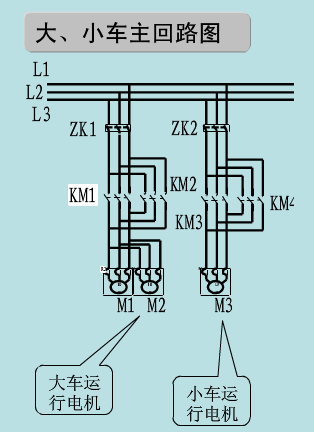 大小車運(yùn)行電機(jī):其均靠接觸器進(jìn)行控制正反向,接觸器均有互鎖,其中大車運(yùn)行電機(jī)各帶前后兩個行走輪,一般為單電機(jī)驅(qū)動,也有前后雙電機(jī)配置。下面是大小車主回路圖。