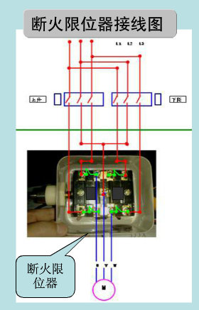 斷火限位器作為電動葫蘆后一道電氣防線,平常不要使其頻繁動作,在其下級要再裝一個限位開關(guān),二者距離要適當(dāng)。下面是斷火限位器接線圖: