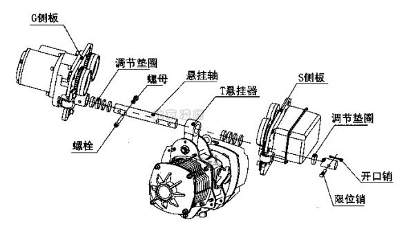 1、? 將懸掛軸插入側(cè)板G,并用懸掛軸螺栓、螺母將其鎖定